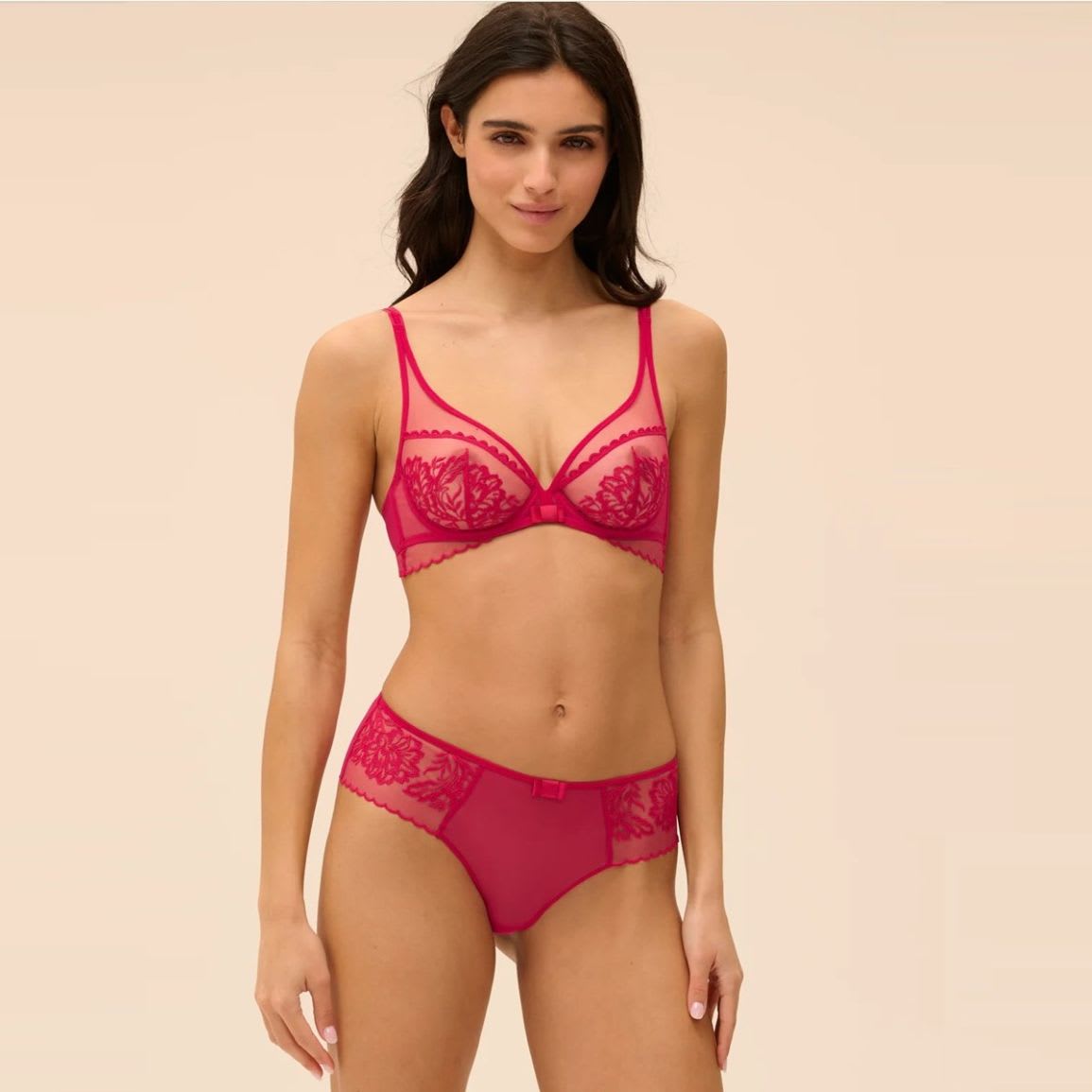 Underwired bra in embroidered tulle. Full cup triangle shape with plunging neckline. Black floral embroidery on sheer nude tulle. Excellent support and shaping for fuller busts. Scalloped edging enhances the décolletage. Lightweight feel with no padding. Adjustable decorated straps. Comfortable tulle back.