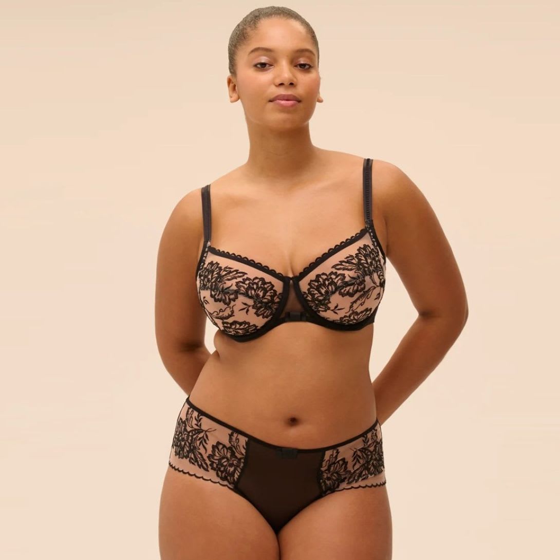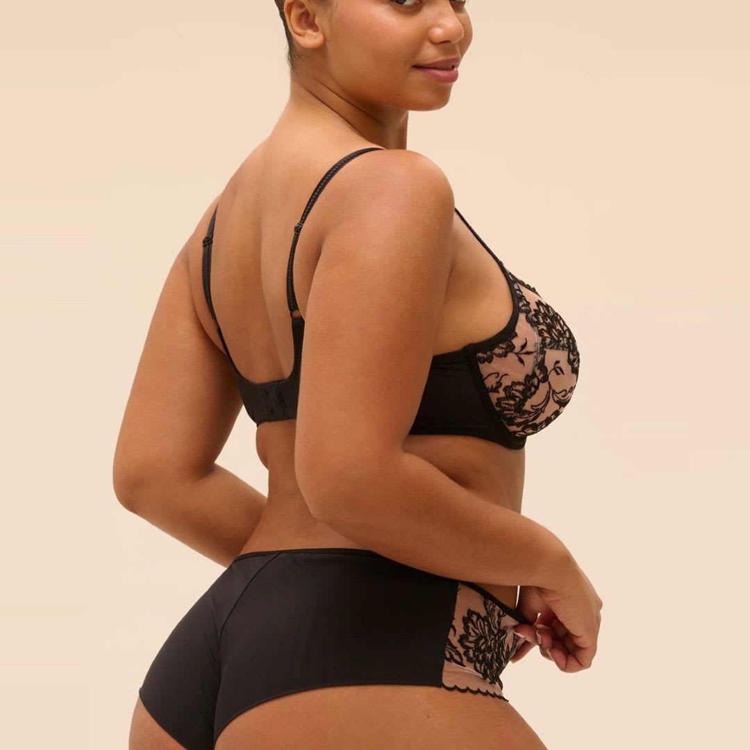Underwired full cup bra in embroidered tulle. 3-part construction to lift, shape and centre. Lined sides and lower cups for reinforced support. Square neckline with scalloped detailing. Supportive tulle back for secure fit. Adjustable decorated straps. No padding.