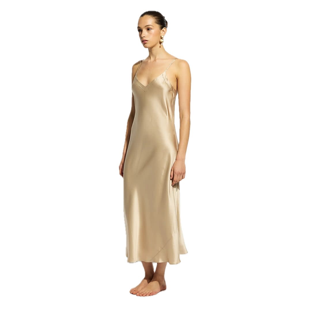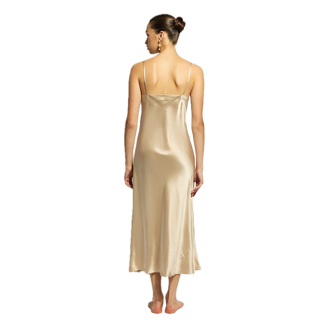 The Silk Long Nite V Neck Slip is a timeless midi dress that is ideal for layering under sheer outfits, sleepwear, or wearing alone. Bias-cut in 100% silk that falls to create a beautiful silhouette. Spaghetti straps from the same silk are adjustable for a perfect fit. A style that effortlessly transitions between sleep and street.