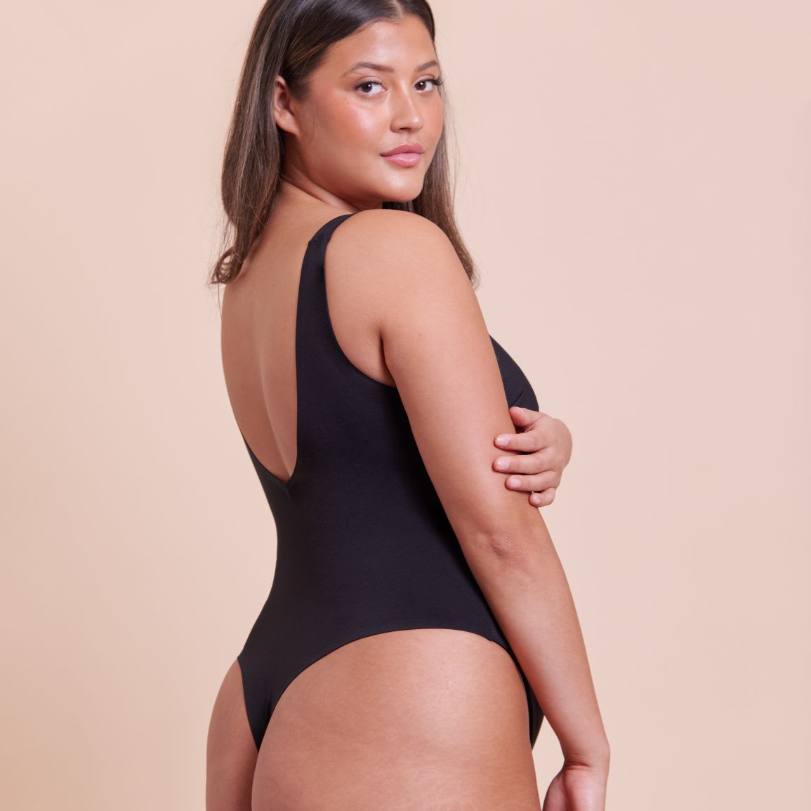 With hidden internal stretch cups, the smoothie secret support body offers support and an endlessly flattering shape. Bonded edges on the leg offer a clean and modern finish, whilst the scooped open back and thong make it perfect for outerwear solutions.