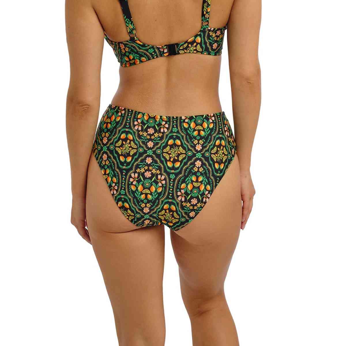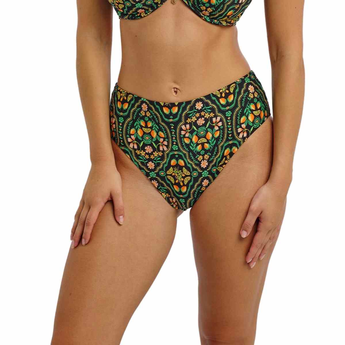 Soak up the sun in Sunset In Seville, Freya’s stunning new print for the season. Inspired by sun-kissed citrus groves and traditional Andalusian tiles, this vibrant collection combines jade, zesty tones, and golden hues on a sleek black background, with select styles featuring a decorative gold leaf trim. The Santa Ana High Waist Bikini Brief offers a flattering fit with its high-rise waist, scoop leg line, and medium bottom coverage — perfect for a chic and comfortable summer look.