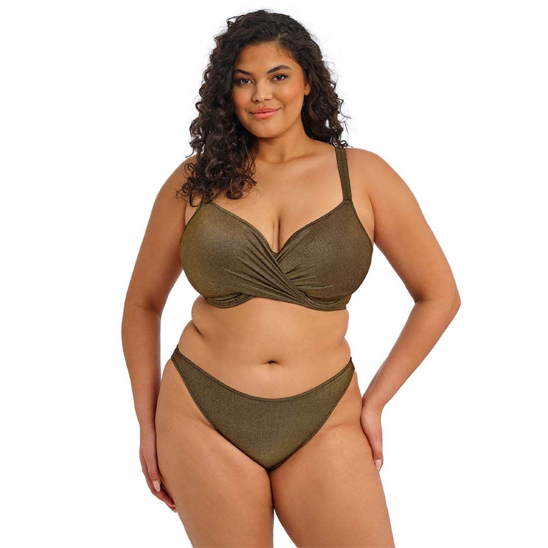 The Sunset Shimmer Plunge Bikini Top features a stretch top cup with an inner support layer and a wrap front outer for a flattering shape. It is cut from a shimmering stretch fabric with a soft metallised yarn for a subtle sheen. The inner top cup is crafted from powernet for enhanced comfort and ease of fit. Fully lined with a light yet supportive inner bra structure, it offers a bikini look with the trusted fit of an Elomi lingerie bra. A powernet back lining provides additional support, while adjustable shoulder straps allow for a customised fit.