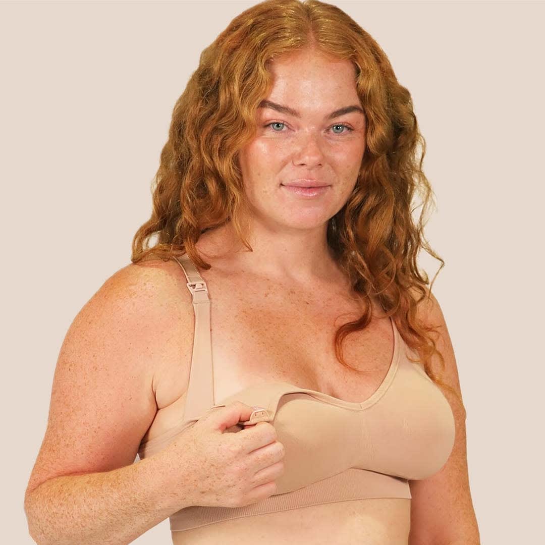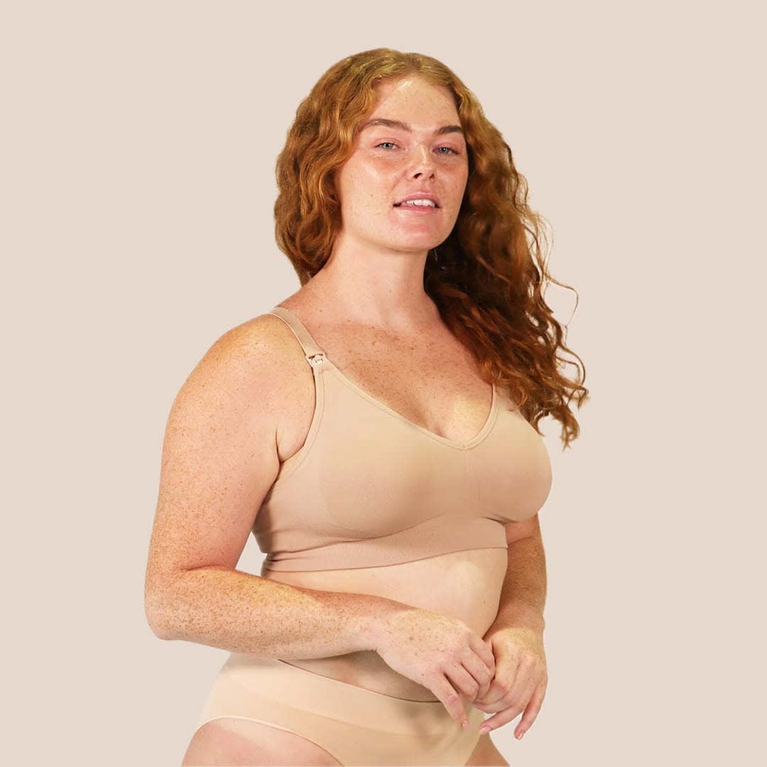 This is the seamless Tiramisu Ultimate Nursing Bra. Expertly contoured and shaped with a fabricated sling, Tiramisu supports, separates, and adapts to your body. The neckline is flattering, making it versatile under low-cut tops and dresses.