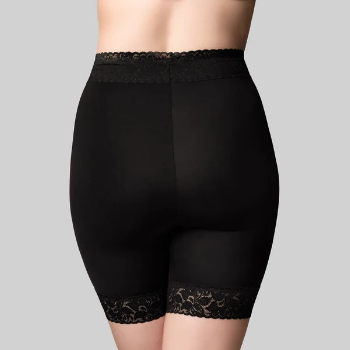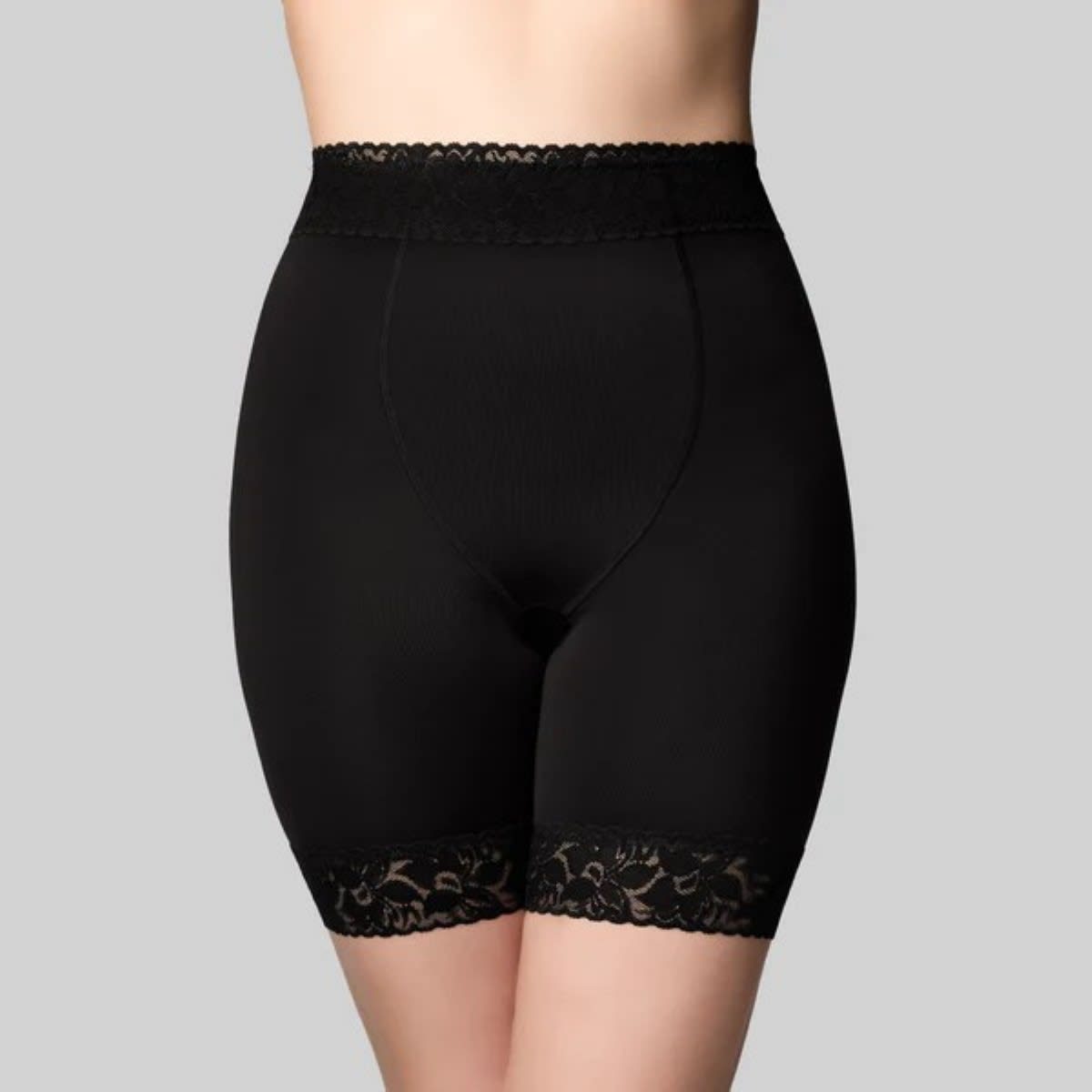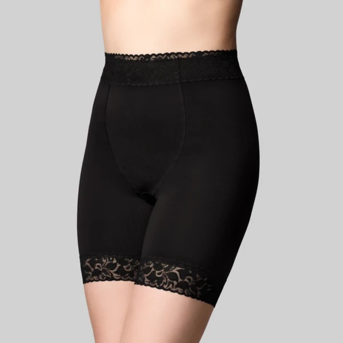 Our Anti Chaffing Short is designed to prevent thigh chaffing and also shapes the figure. It sits high to the waist with a tummy support panel. Ideal for those who have had tummy surgery, C. sections or just need a little more support and not a full control garment. The leg line sits mid-thigh. It is made from a silky stretch fabric for a comfort fit and smoothing.