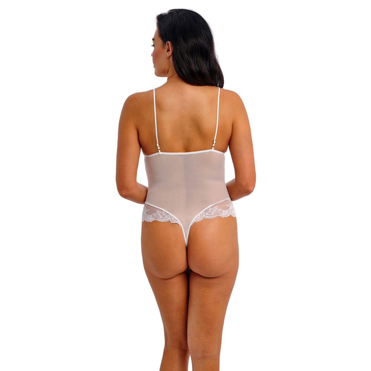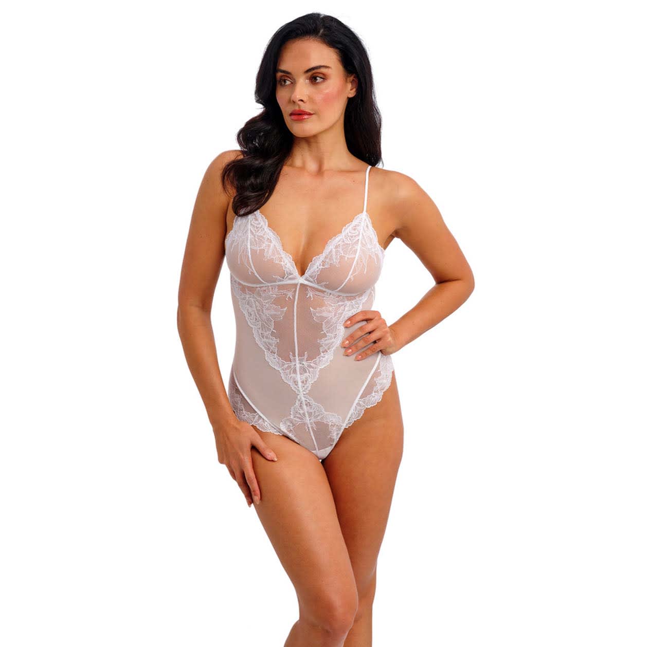 The Vivid Attraction Body is a captivating lace bodysuit designed for a striking look. It features lace with a bold floral pattern and scalloped edge in the front, beautifully contrasted with stretch mesh in the back. For a customized fit, it includes fully adjustable straps and elegant gold hardware. This pull-on style bodysuit boasts a thong-back and a cotton gusset (without hook-and-eye closure) for comfort and seamless wear.