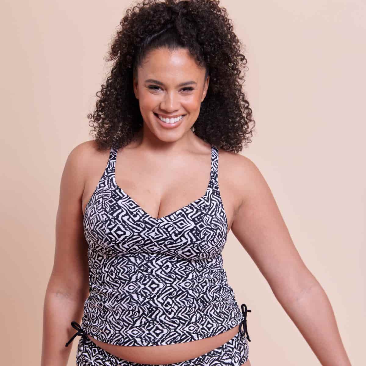 In a classic black and white print comes Wild Horizons. Non-wired, non-padded tankini with side ties to adjust and dual cup sizing.