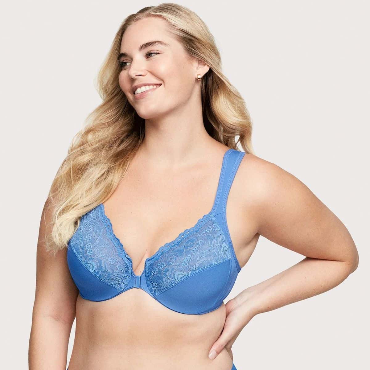 WonderWire® design features a padded underwire with an extra layer of cushion to prevent wire poke. Lace-topped cups feature side-bust control to shape and support. Easy on and off secure front closure. Wide, cushioned straps adjust to your fit.