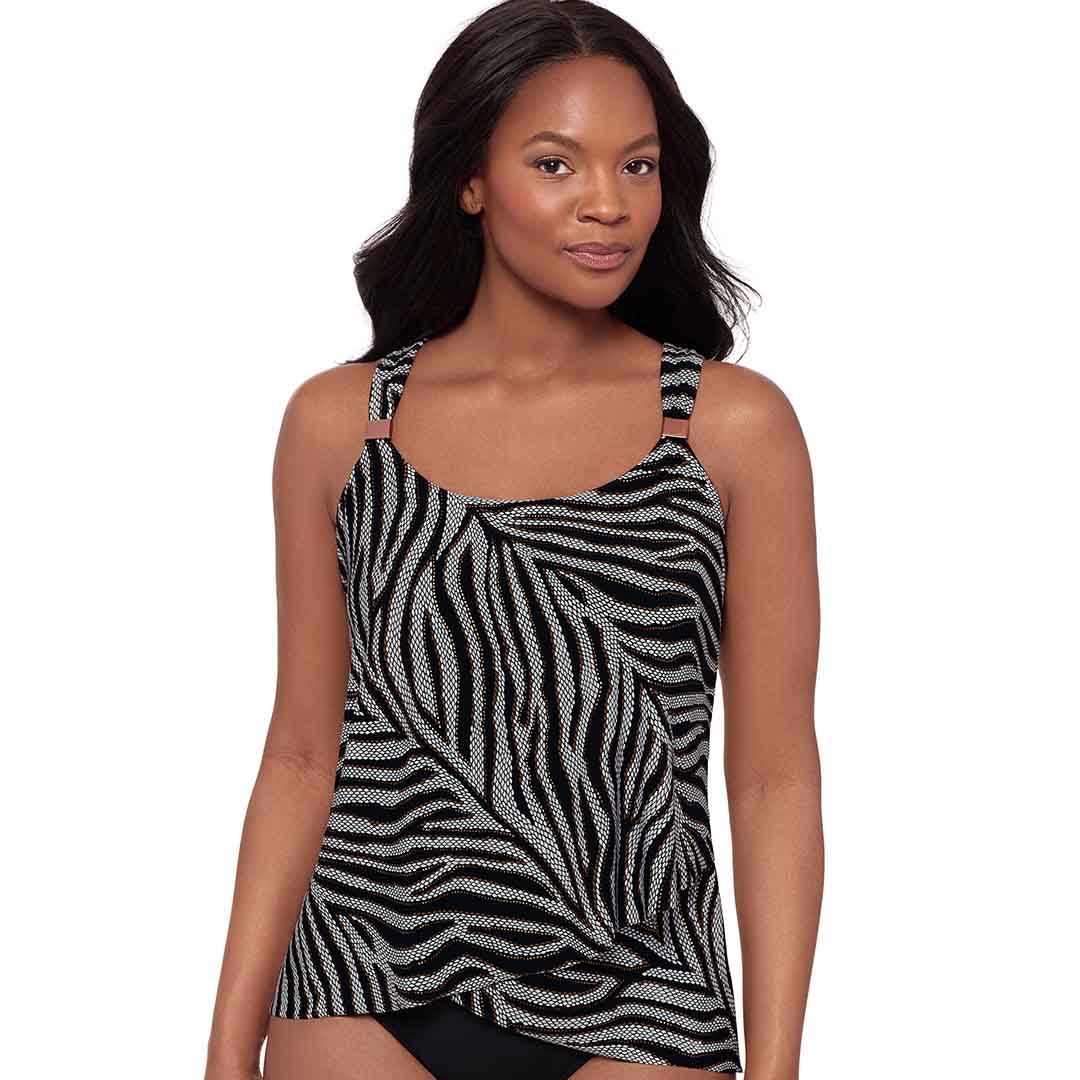 This floaty Zirconic Dazzle Underwired Draped Tankini Top features a double-layered, loose-fit design for full tummy coverage, a graphic wild animal print with metallic bronze edges, a flattering scoop neckline, adjustable shoulder straps with jewellery hardware accents, and a draped front for elegant, confidence-boosting style.